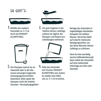 Befülle das saubere Katzenklo ca. 5–7 cm hoch mit PRIMOX® KLUMPSTREU. Für gute Hygiene in der Toilette deines Lieblings solltest du täglich die Klumpen und festen Ausscheidungen entfernen. Die Klumpen kannst du im Hausmüll oder in der Biotonne entsorgen (regionale Entsorgungsvorschriften beachten). Bitte spüle die Klumpen nicht die Toilette hinunter – Verstopfungsgefahr! Fülle das Katzenklo mit frischer PRIMOX® KLUMPSTREU auf, sodass du wieder eine Höhe von ca. 5–7 cm erreichst.